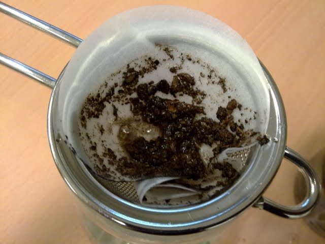 Después hemos seguido con nuestro particular arsenal de utensilios caseros. La hemos filtrado con un colador y papel de filtro de cafetera.