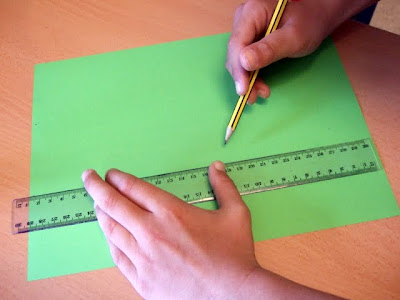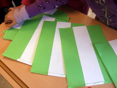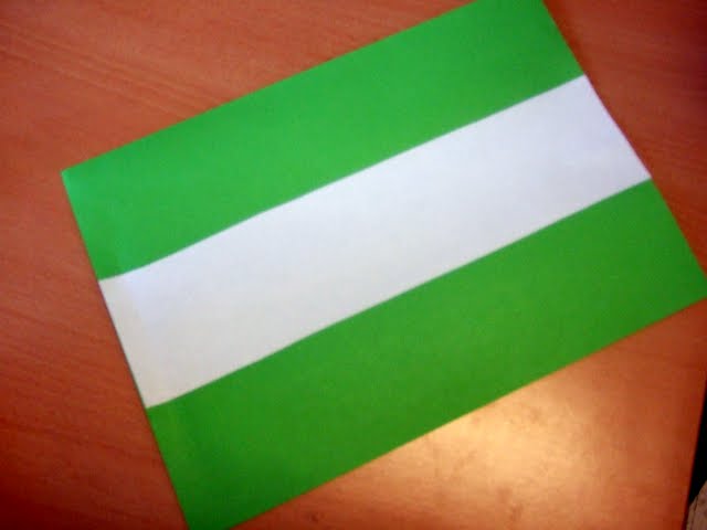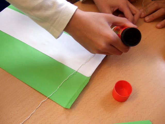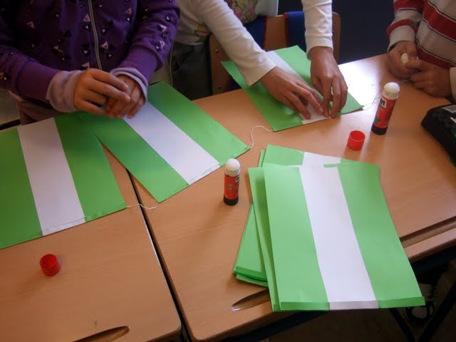 - Los materiales: un folio verde y otro blanco, los colores de la bandera; tijeras, pegamento y cuerda. Falta la regla, se nos olvidó al hacer la foto.