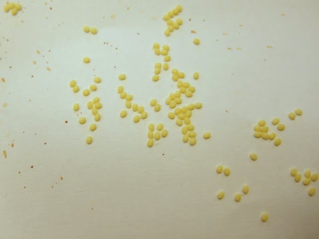Como curiosidad, antes que las separáramos de los capullos y las lleváramos a otra caja forrada con papel para conservar mejor los huevos, alguna mariposa puso sus huevos encima de un capullo.